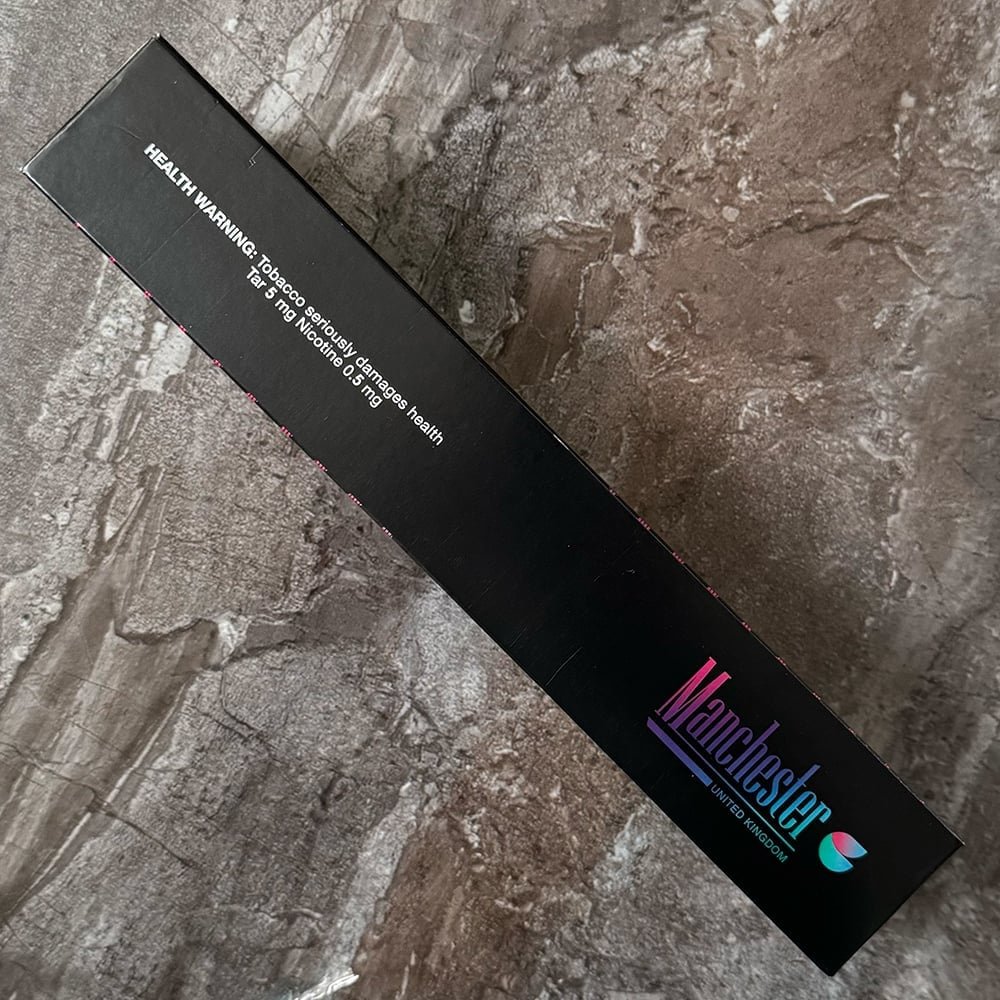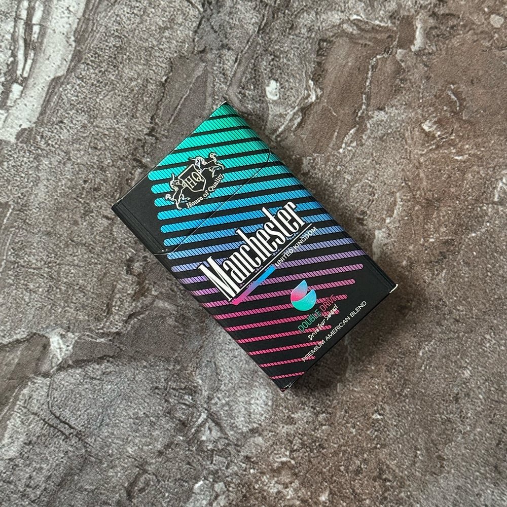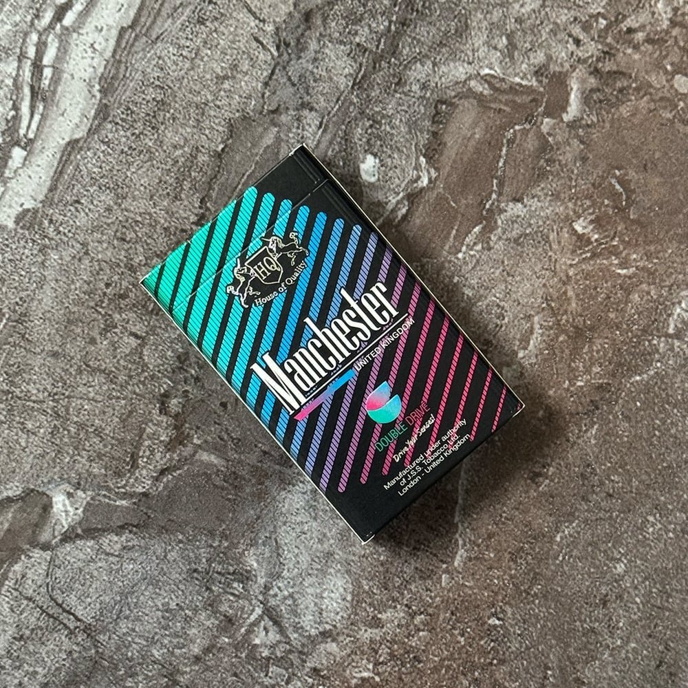 Manchester Double Drive Blueberry Mint cigarettes. Manchester represents first step towards the Double Capsule filter format. This SKU comes in a premium packaging, with a specially developed blend to complement the capsule flavor deliveries. Double Drive format brings a mint and blueberry flavored capsule to enhance your smoking experience at will.